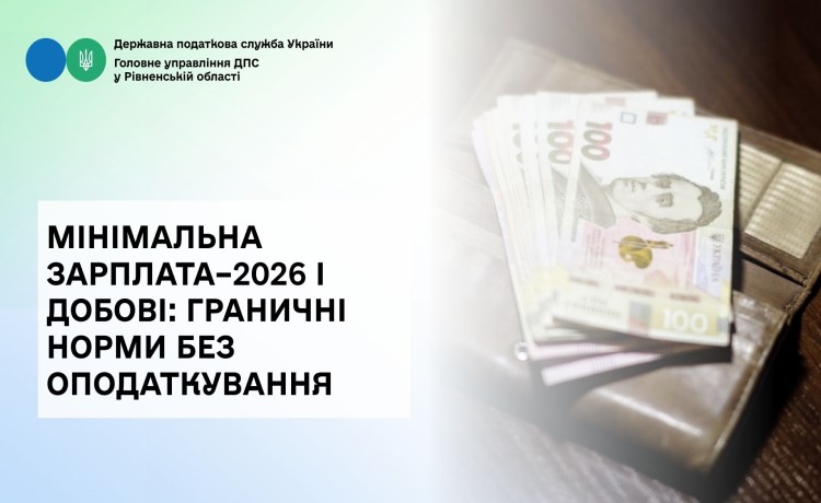 Головне управління ДПС у Рівненській області нагадує, що з 1 січня 2026 року Законом про Державний бюджет України на 2026 рік встановлено, що впродовж 2026 року мінімальна заробітна плата становить 8647 гривень.